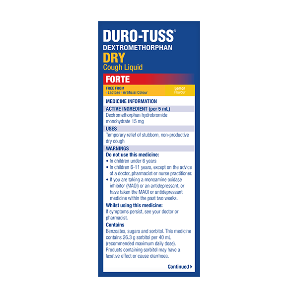 Dextromethorphan hydrobromide monohydrate 15mg (per 5mL), Benzoates, sugars and sorbitol. This medicine contains 26.3g sorbitol per 40mL (recommended maximum daily dose). Products containing sorbitol may have a laxative effect or cause diarrhoea.