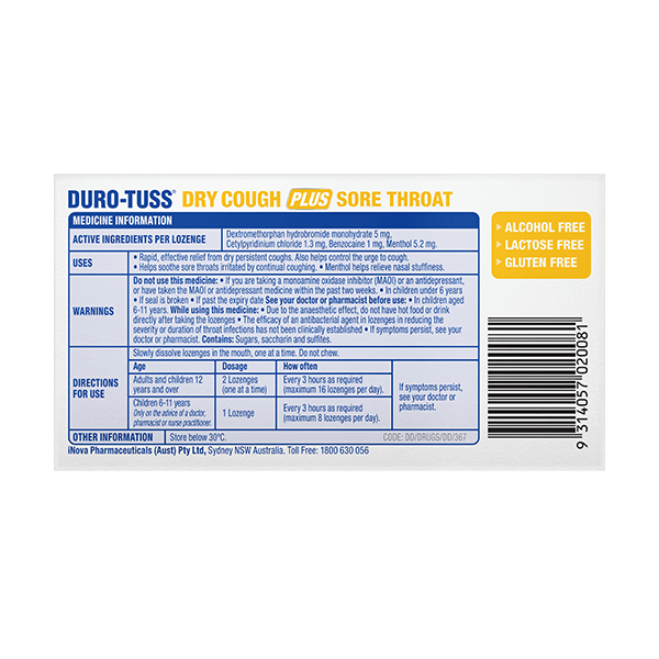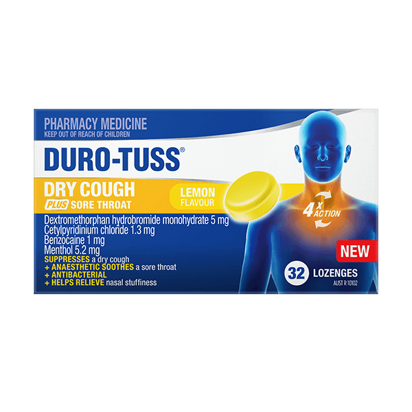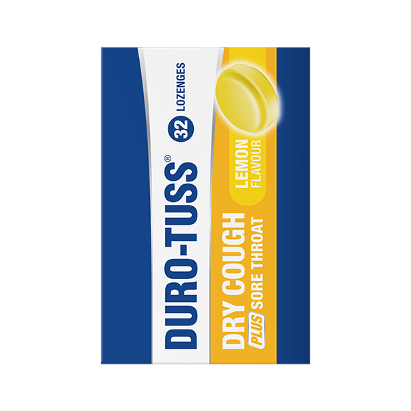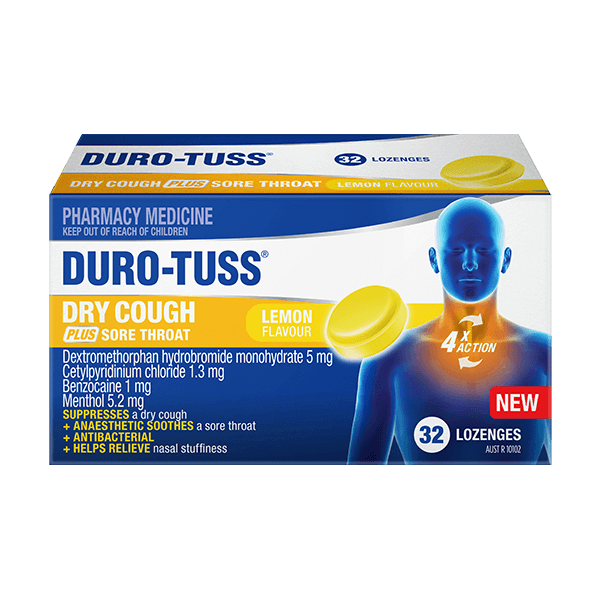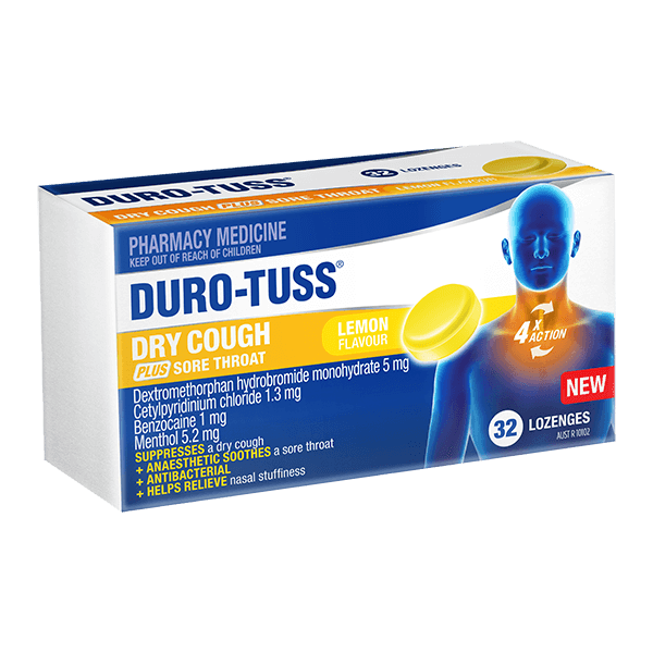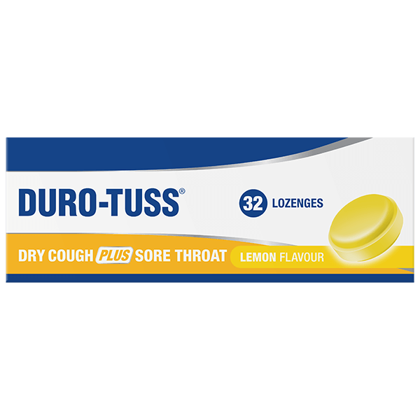 DURO-TUSS Dry Cough PLUS Sore Throat Lemon Lozenges have a 4X action: SUPPRESSES a dry cough + ANAESTHETIC SOOTHES a sore throat + ANTIBACTERIAL + HELPS RELIEVE nasal stuffiness.
